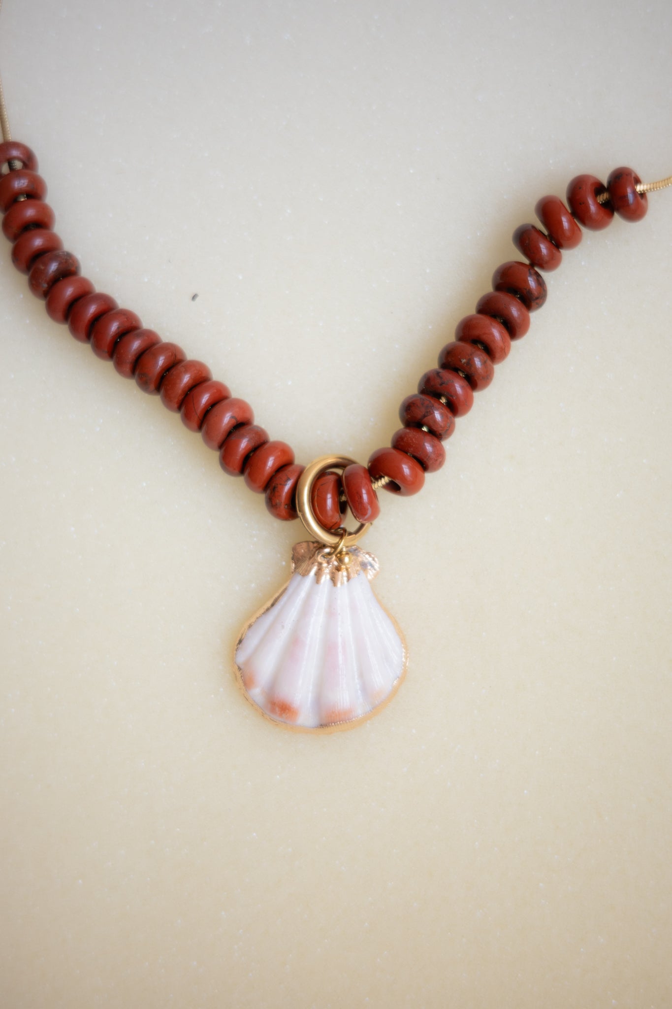 Este collar combina una cadena de acero inoxidable color dorado con cuentas de ágata natural en tonos terracota junto con un charm removible de concha natural con contorno dorado.